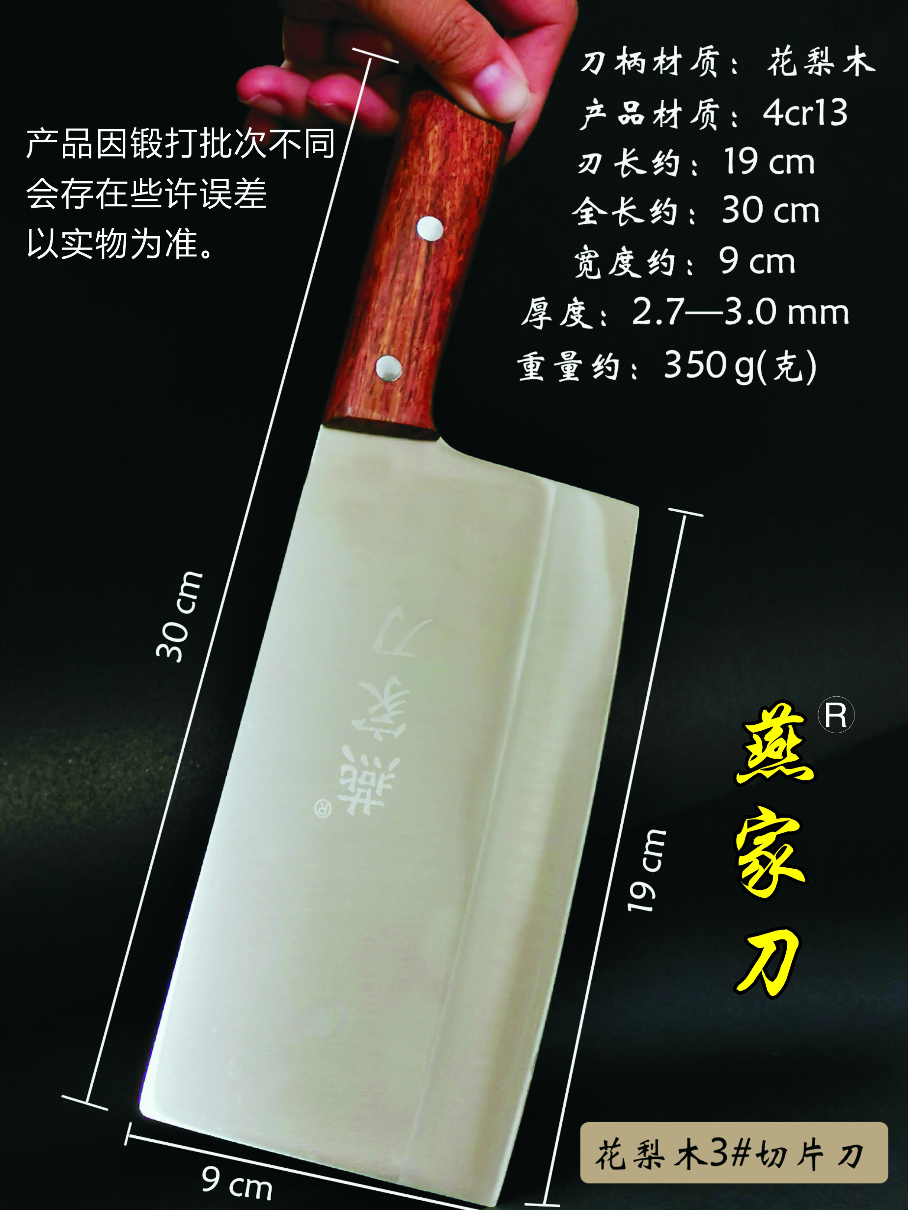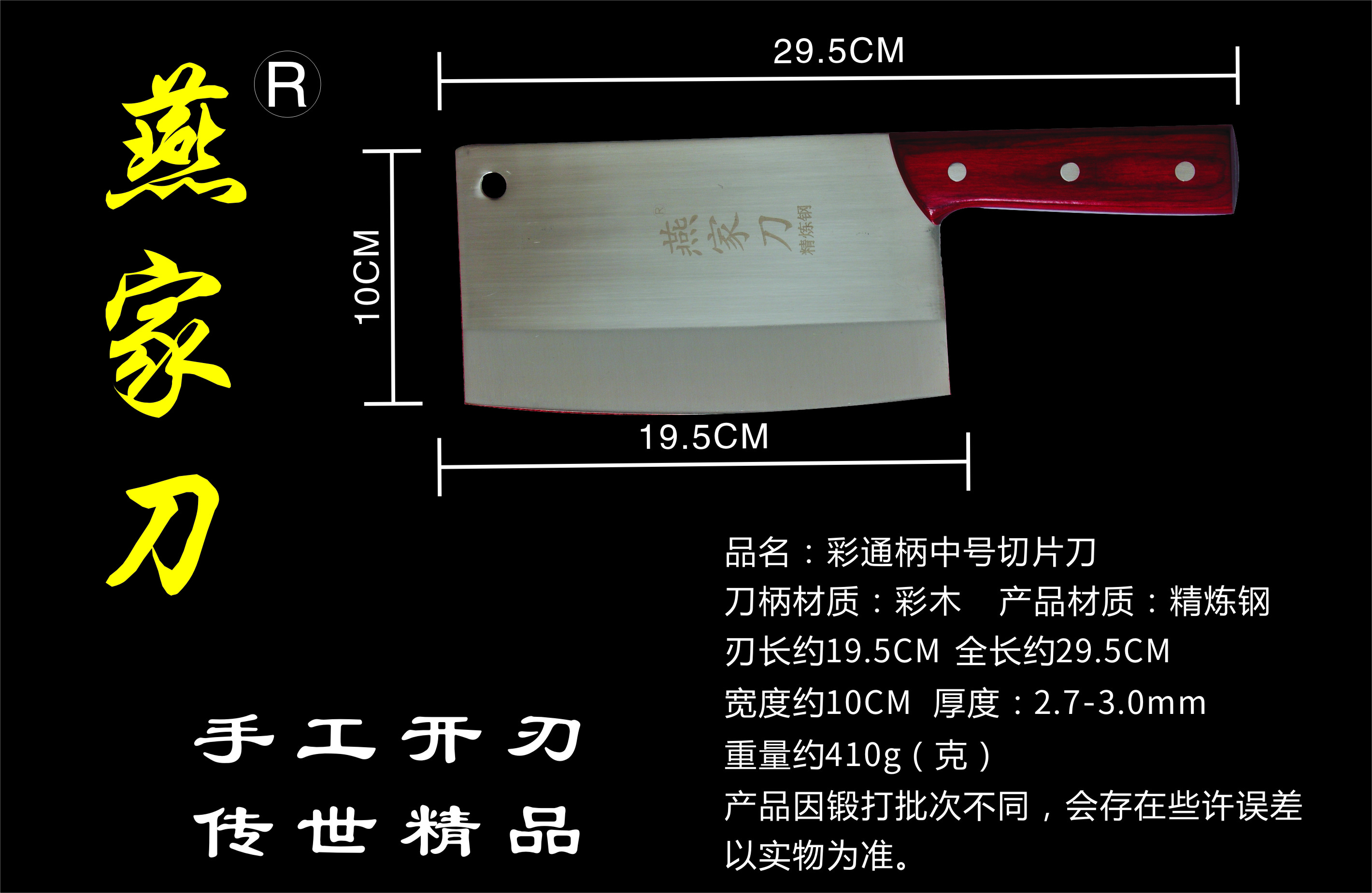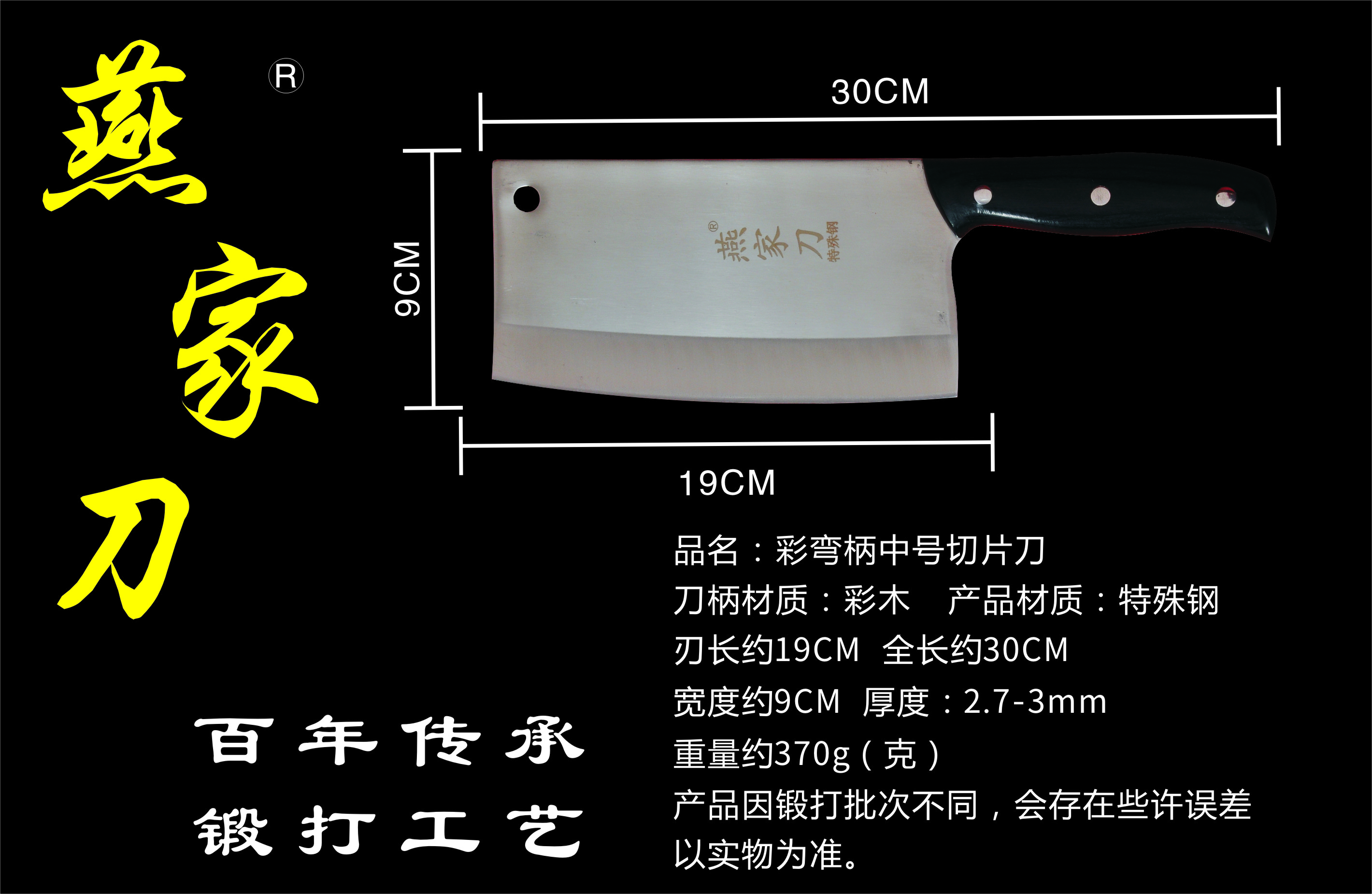 樂山燕家刀具有限公司(公司前身為燕佳鐵匠鋪),公司坐落于美麗的佛都之鄉(xiāng)樂山嘉州,在全國各地有上千家代理經(jīng)銷點,公司專業(yè)銷售、設計、制作各類刀具。秉承一貫鍛造三精要求,即選料精、用料精、工藝精。所選材料全部產自滇東鐵礦優(yōu)產區(qū)。本品牌刀具堅持千挑萬選為材,千錘百煉為刀的手工鍛造工藝宗旨。具有鋒利耐磨、持久耐用,用料上乘,硬度高、韌度強的特點!
